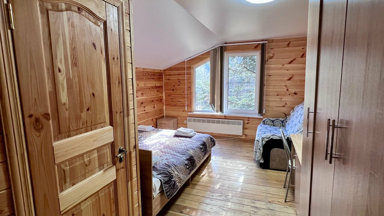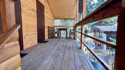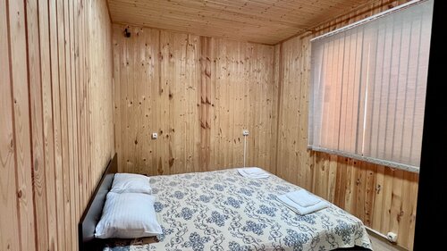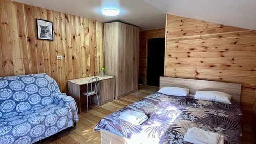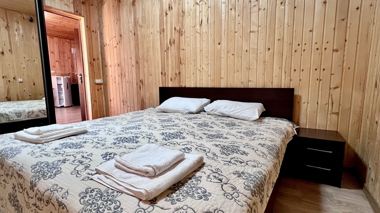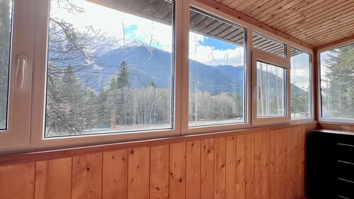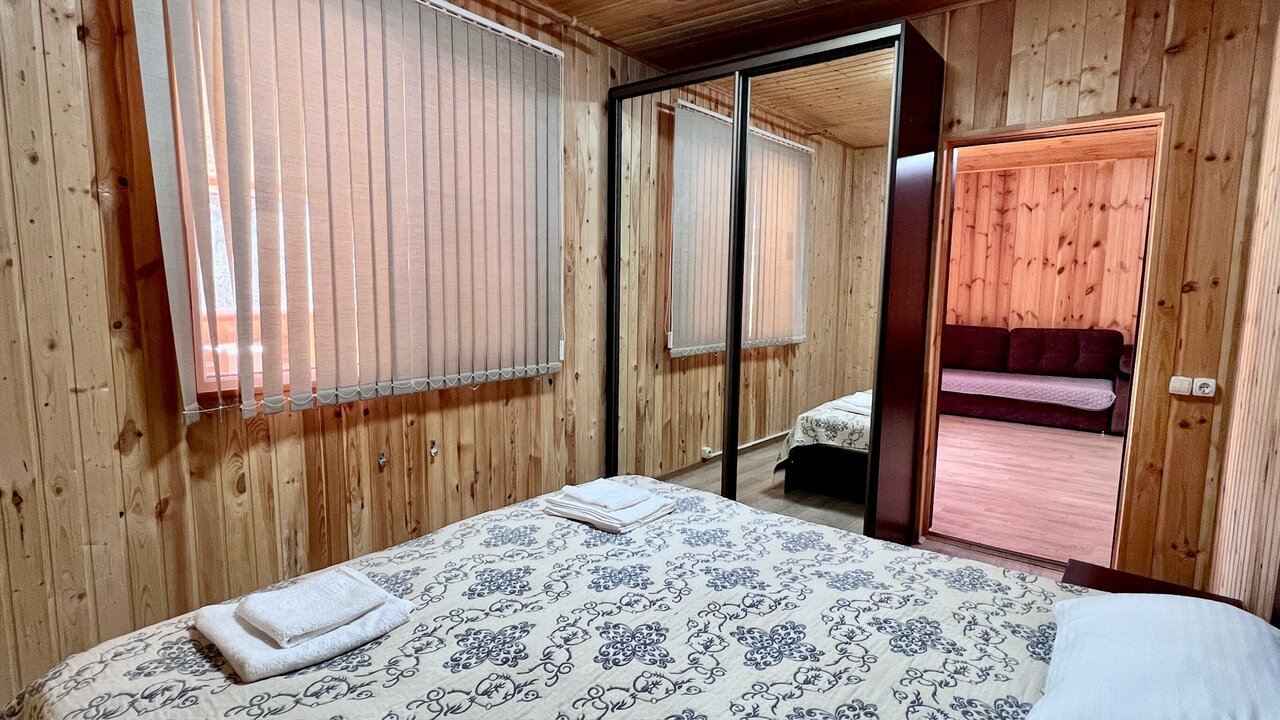 В доме 2 отдельные комнаты с двуспальными кроватями, гостинная с диваном , терасса застекленная с видом на горы, когда светит солнышко- там тепло, месторасположение в лесу у подножия горы, в пешей доступности есть кафе Маринад. Наличие стиральной машины, фена тоже немаловажно. Ремонт в доме подустал конечно , но опять же за свои деньги вариант отличный.